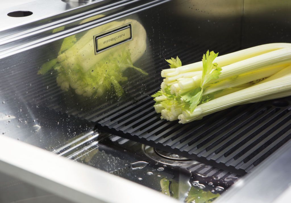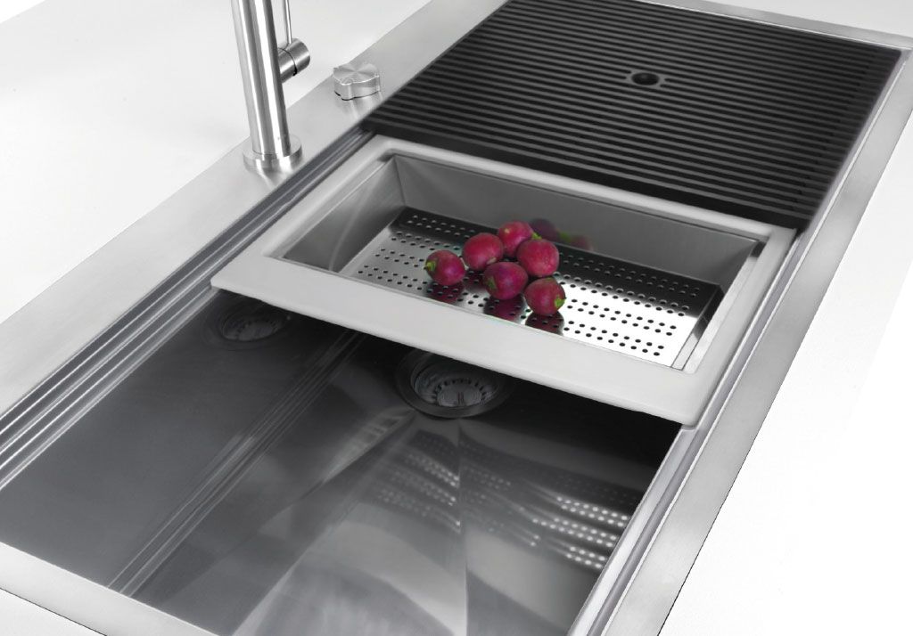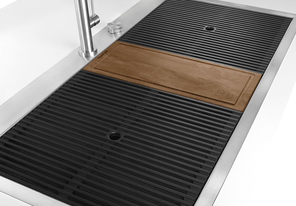 No primeiro, as inovadoras grelhas pretas deslizam, uma superfície grande e prática para lavagem, drenagem e trabalho.