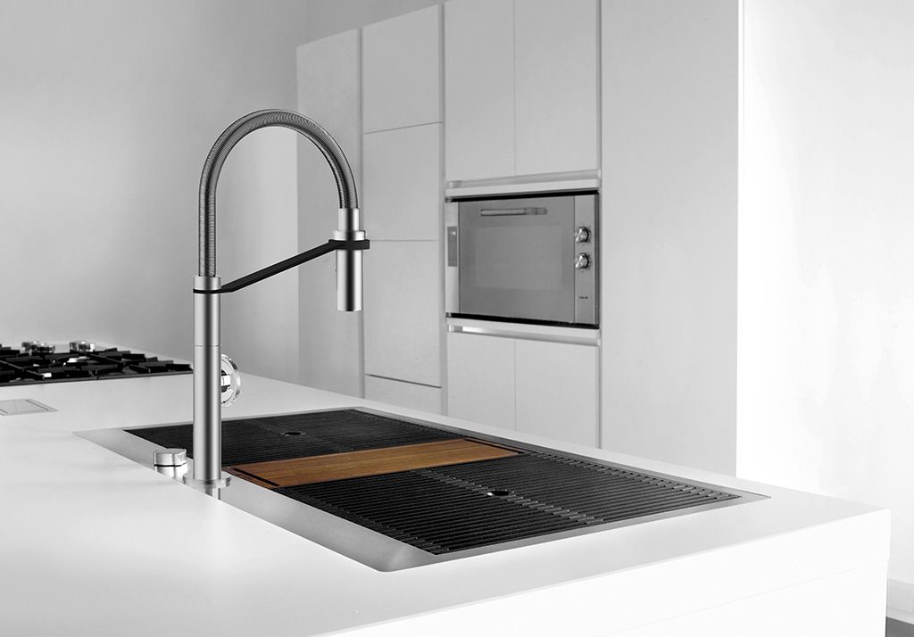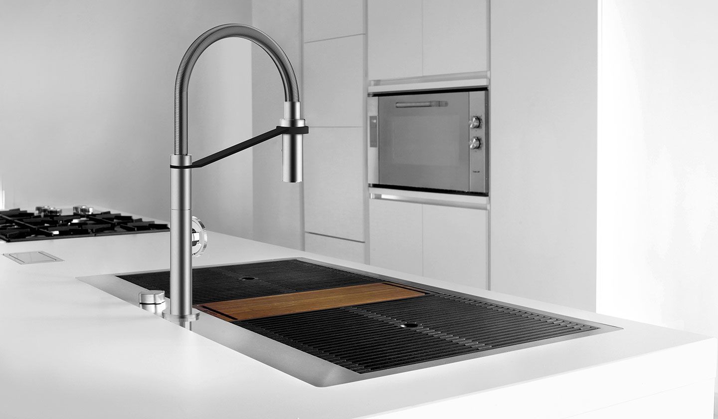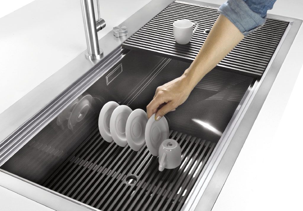 Os lava-loiças F-Milano têm um design engenhoso, com um sistema de armazenamento de três níveis, onde os acessórios são alojados em alturas diferentes.